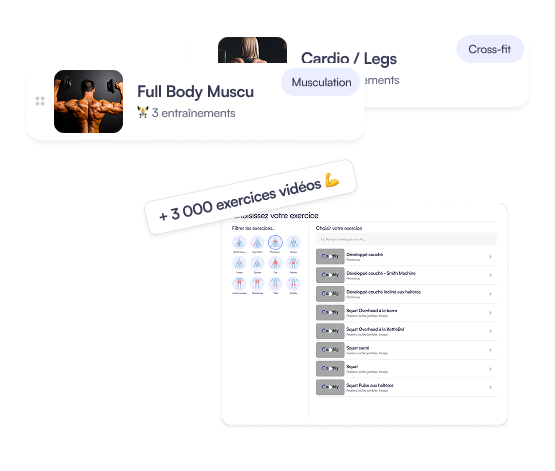 Grâce à une bibliothèque de plus de 3 000 exercices illustrés, tu peux concevoir des séances 100 % personnalisées en fonction du niveau, des objectifs et des contraintes de chaque client. Regroupe-les en programmes cohérents, planifie les semaines d’entraînement, et partage-les en un clic via l’app Coachly. Chaque client reçoit directement son planning dans son interface, avec une expérience claire et motivante. Finis les PDF éparpillés et les suivis manuels !